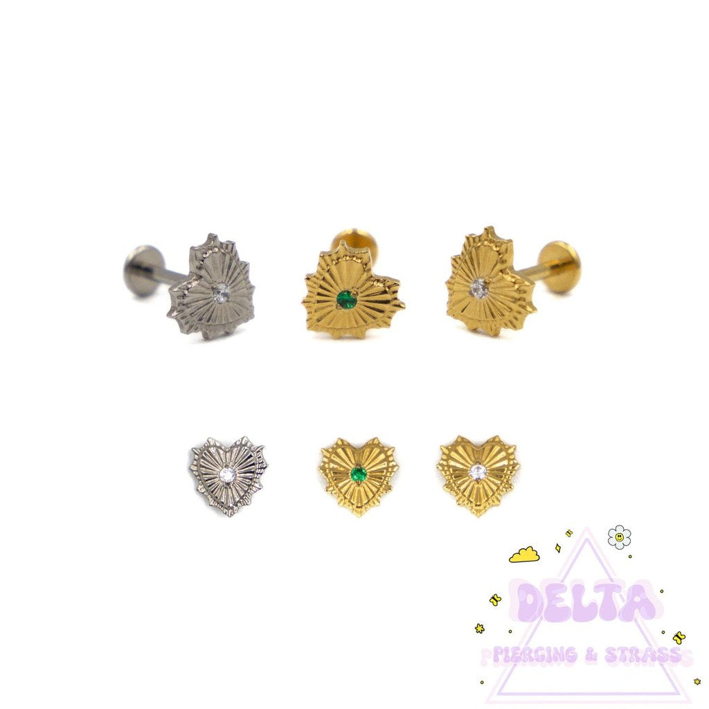 Fais rayonner ton oreille avec ce piercing en titane au design unique de cœur en forme de soleil. Disponible en finition argentée ou dorée, il est orné d’un strass central blanc (version argent) ou vert (version dorée), pour une touche éclatante et originale.